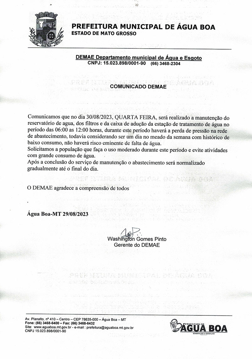 ÁGUA BOA – O Gerente do DEMAE comunica que nesta quarta-feira, dia 30/08/2023, será realizada a manutenção do reservatório de água, dos filtros e da caixa de adução da Estação de Tratamento.