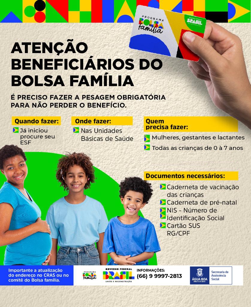 ÁGUA BOA - Todos os beneficiários do Programa Bolsa Família de Água Boa estão sendo convocados para comparecer nas unidades de Estratégia de Saúde da Família (ESF) para realizar a pesagem obrigatória referente ao segundo semestre de 2023.