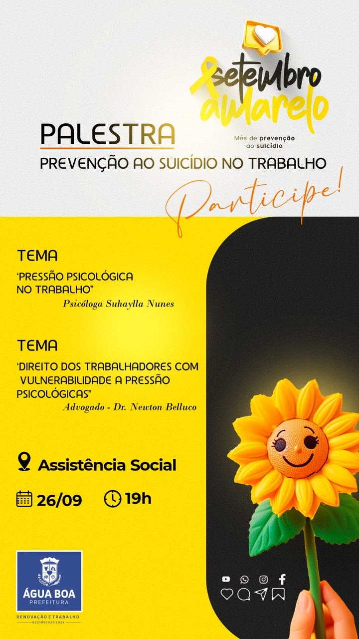 ÁGUA BOA - A Prefeitura por meio do Sistema Nacional de Emprego (Sine), promoverá o evento: “Prevenção ao suicídio no trabalho”, em alusão ao Setembro Amarelo.