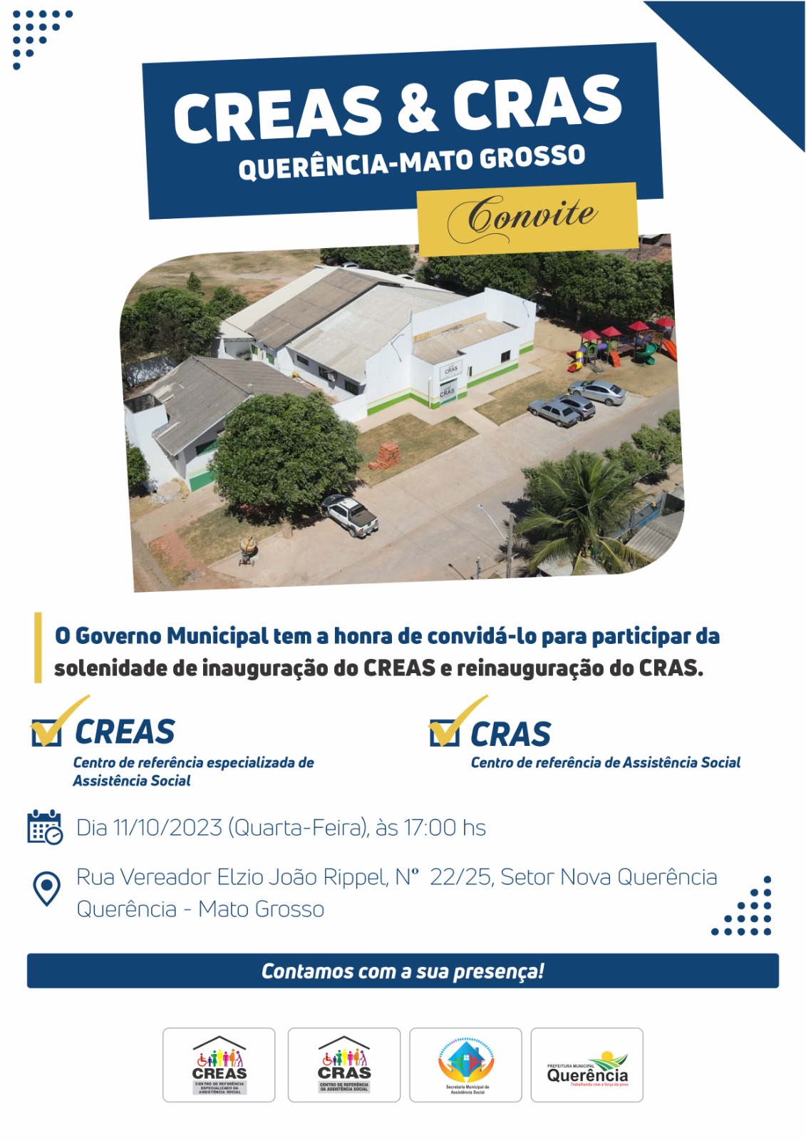 ===========================================================QUERÊNCIA - O Governo Municipal tem a honra de convidá-lo para participar da solenidade de inauguração do CREAS (Centro de Referência Especializada de Assistência Social) e reinauguração do CRAS (Centro de Referência de Assistência Social).