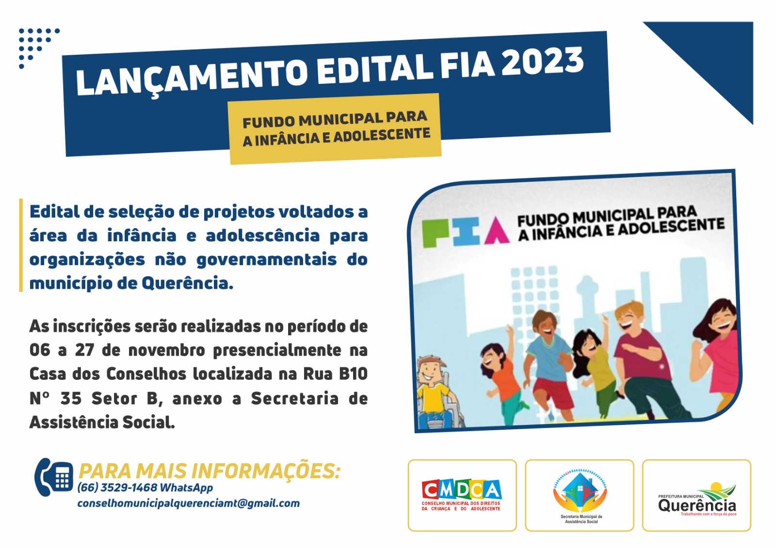 QUERÊNCIA – O FIA (Fundos da Infância e da Adolescência), lança o edital de seleção de projetos voltados a área da infância e adolescência para organizações não governamentais e governamentais do município de Querência.