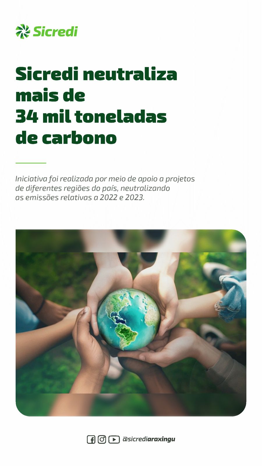Integrante do Pacto Global das Nações Unidas (ONU), o Sicredi realizou a neutralização das emissões calculadas no seu Inventário de Gases de Efeito Estufa de 2022 e projetadas para o ano de 2023. Ao todo, foram neutralizadas 34.565 toneladas de carbono provenientes da operação de todas as sedes administrativas e agências. A neutralização foi realizada por meio de apoio a sete projetos de créditos de carbono de diferentes regiões do Brasil.