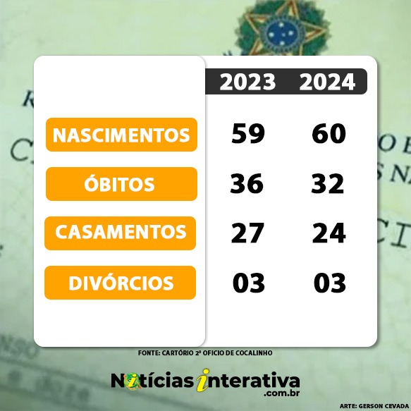 COCALINHO – O Cartório do 2º Ofício liberou informações sobre os nascimentos, óbitos, casamentos e divórcios registrados no ano passado em Cocalinho.