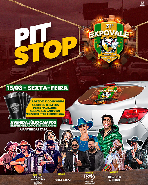 ÁGUA BOA - A 31ª EXPOVALE está chegando e o 1º Pit Stop acontecerá no dia 15 de março, a partir das 17h30, a Avenida Júlio Campos, em frente ao Posto Ipiranga.