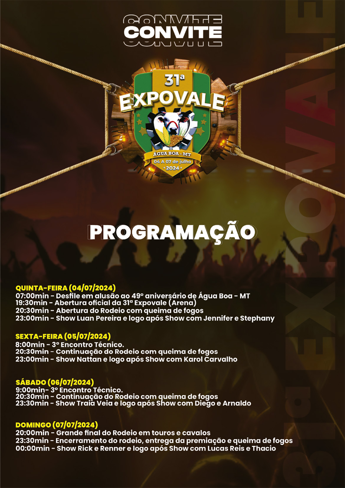 Programação da 31ª Expovale 2024ÁGUA BOA - Confira a programação da 31ª Expovale:
