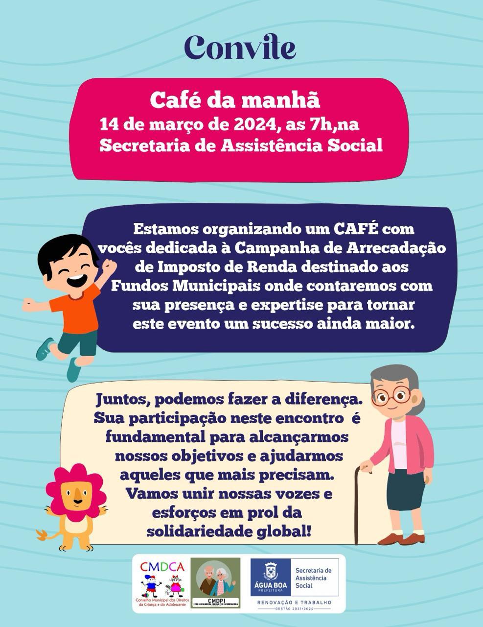 ÁGUA BOA - Um café da manhã será realizado nesta quinta-feira, 14 de março, na Secretaria de Ação Social.