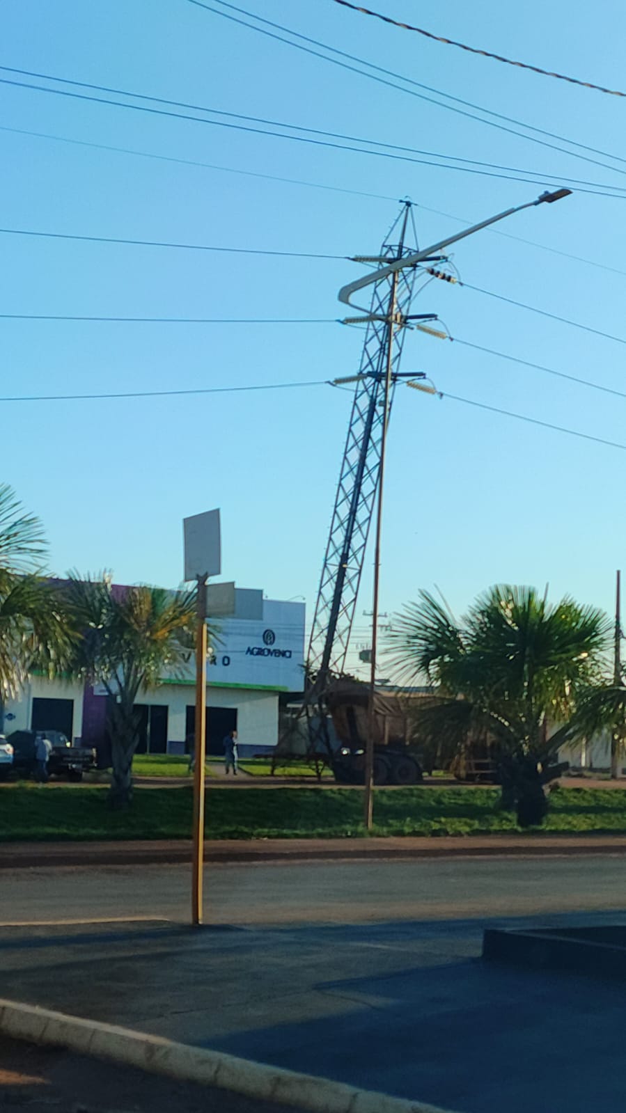 QUERÊNCIA - Uma torre de alta tensão localizada na Avenida Sul, em frente à empresa Lavoro, encontra-se em uma situação delicada, gerando preocupação quanto à possibilidade de queda. Segundo relatos preliminares, um caminhão aparentemente colidiu contra a torre, resultando na atual situação em que apenas os cabos de energia sustentam a estrutura.
