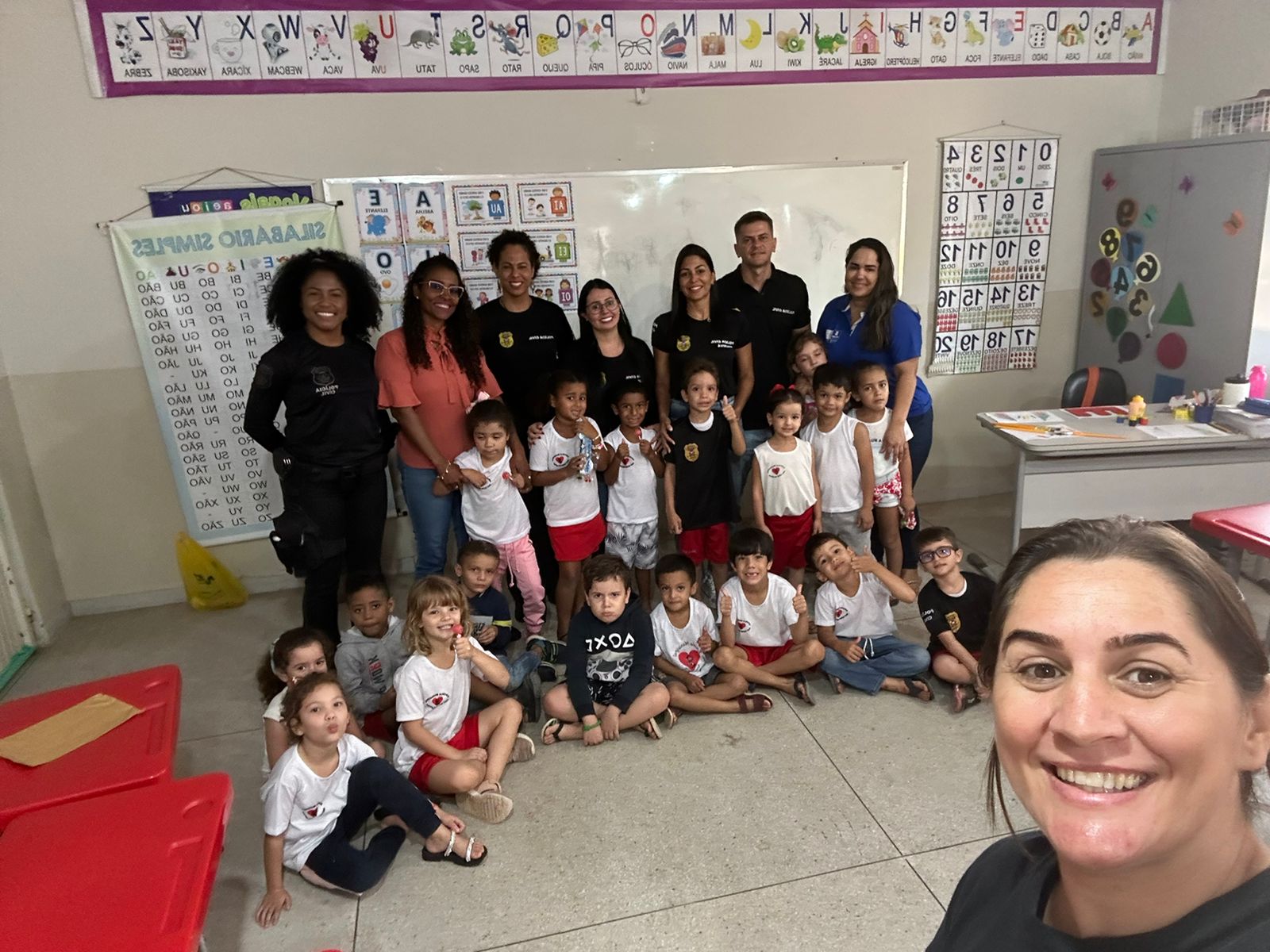 Eles realizaram uma visita na sala de aula, onde aconteceu um pequeno bate-papo com as crianças sobre a importância do estudo e de obedecer aos papais e professores.