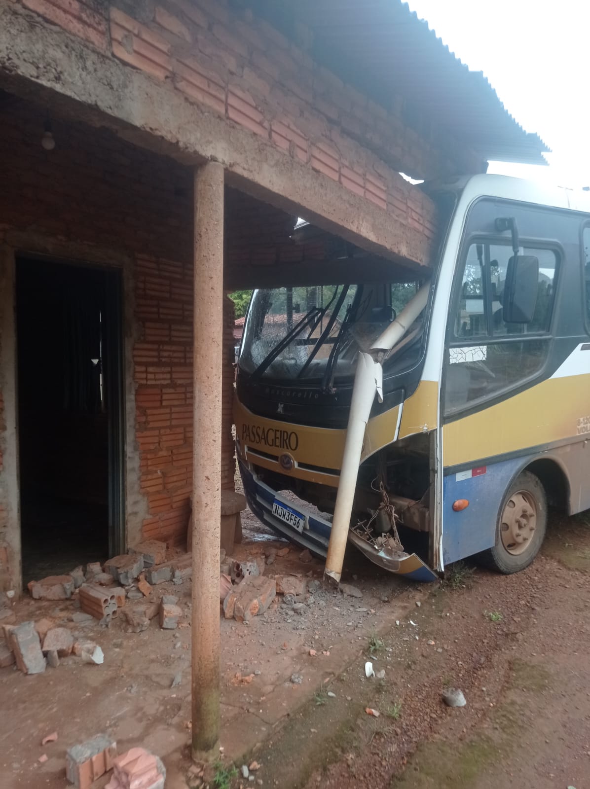 Um ônibus escolar desceu uma rampa hoje, bateu em uma placa e colidiu com uma casa no povoado.