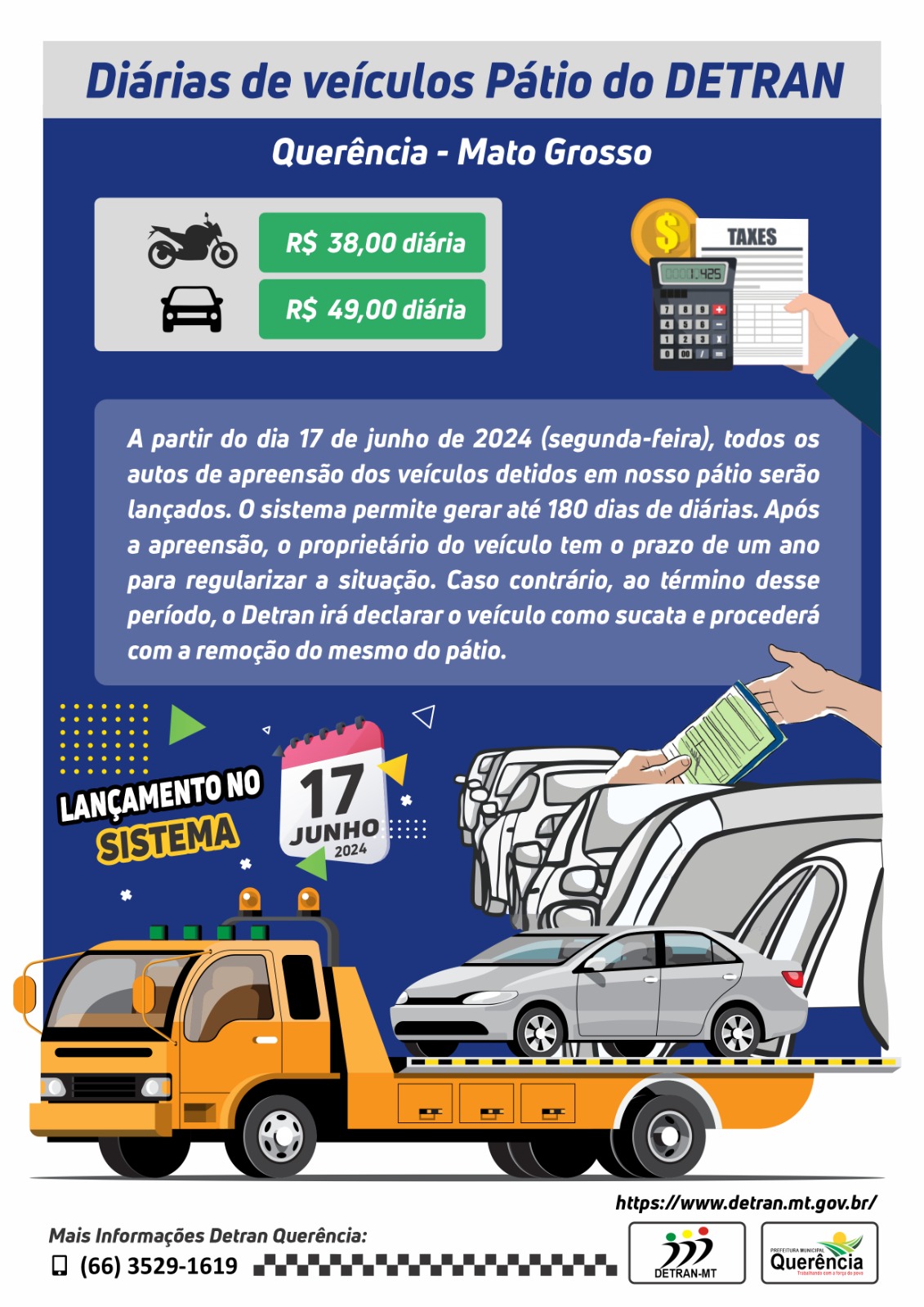 QUERÊNCIA - A partir do dia 17 de junho de 2024 (segunda-feira), todos os autos de apreensão dos veículos detidos no pátio do DETRAN serão lançados no sistema. Os valores das diárias serão de aproximadamente R$ 38,00 para motocicletas e R$ 49,00 para automóveis.