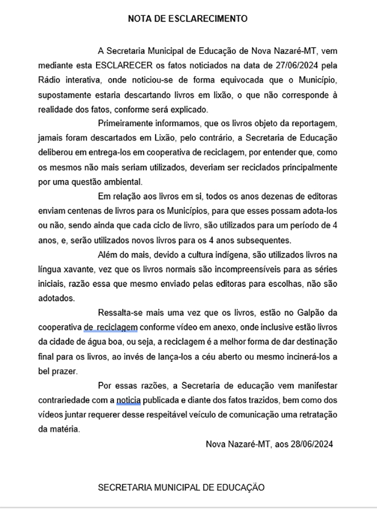 Atualizada dia 28 jun 24 NOVA NAZARÉ - A Secretaria Municipal de Educação de Nova Nazaré emitiu nota de eslarecimento sobre o material didáetico descartado para reciclagem.