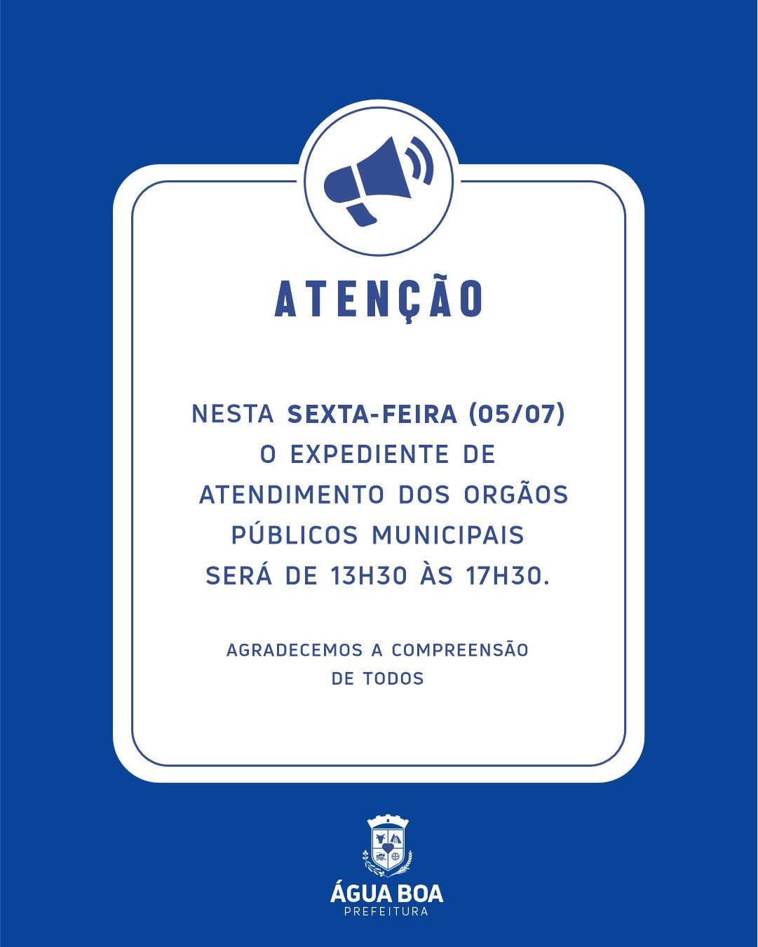 ÁGUA BOA - Hoje o expediente nos órgãos públicos municipais tem horário especial.