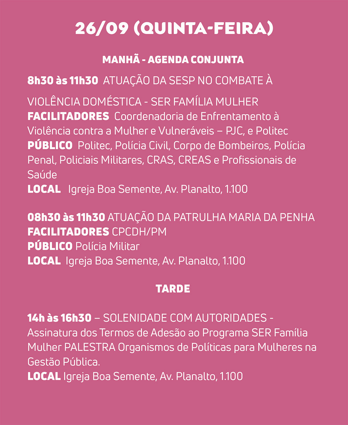 Das 14h às 16h 30min solenidade com autoridades e termo de adesão ao programa SER Família Mulher com palestra.