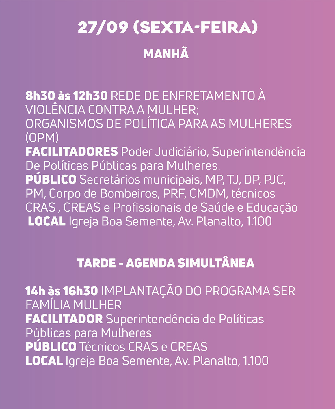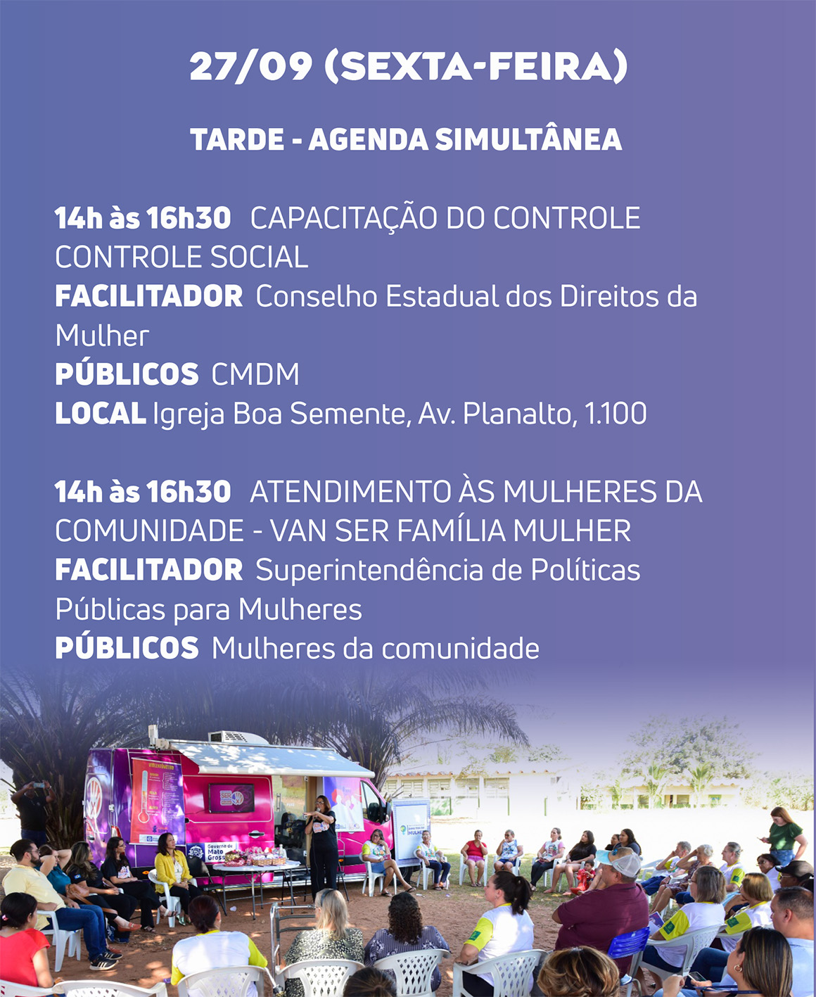 Dia 27/09, continuação da Expedição das 8h 30min às 12h 30min. Serão facilitadores representantes do Poder Judiciário e da Superintendência de Polícias Públicas para Mulheres.