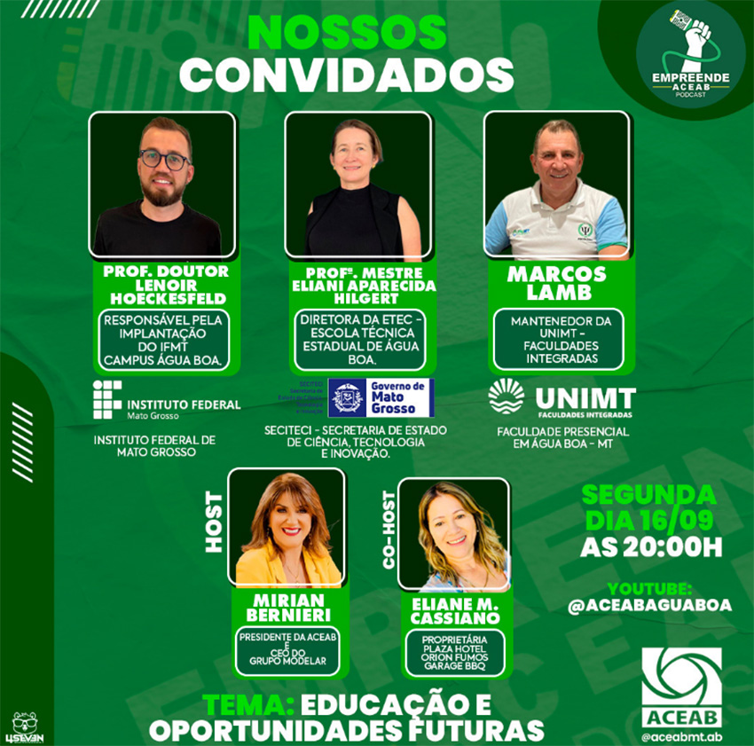 ÁGUA BOA – Hoje, a ACEAB terá mais uma Live na internet, dentro do projeto Empreende ACEAB. A partir das 20h, participarão o Prof. Dr. Lenoir Hoeckesfeld do IFMT local, Marcos Roberto Lamb investidor no ramo de educação, e a Profª. Mestre Eliani Aparecida Hilgert da Escola Técnica Estadual.
