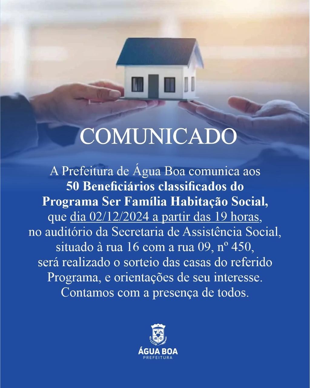 ÁGUA BOA - A prefeitura alerta aos 50 beneficiados com casa popular do programa SER Família Habitação Social para reunião de sorteio.
