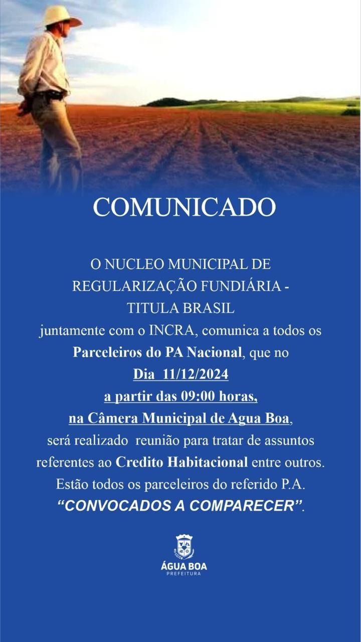 Reunião discutirá crédito habitacional aos parceleiros do PA NacionalÁGUA BOA - O Núcleo de Regularização Fundiária Titula Brasil fará reunião com parceleiros do PA Nacional.
