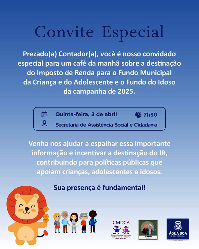 ÁGUA BOA - Café da manhã sobre a destinação do Imposto de Renda ao Fundo Municipal da Criança e do Adolescente e fundo do Idoso será servido nesta quinta-feira, 03 de abril.
