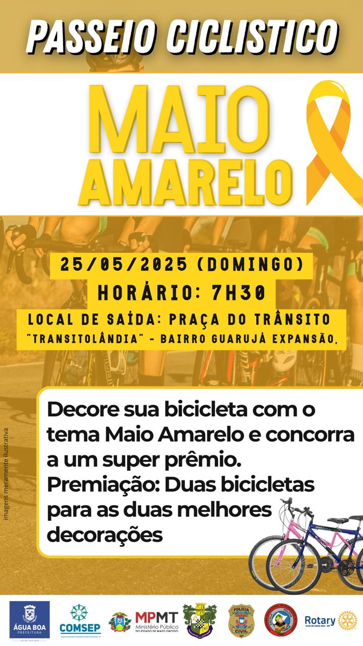 ÁGUA BOA - Neste domingo, 25 de maio, acontecerá o Passeio Ciclístico Maio Amarelo.