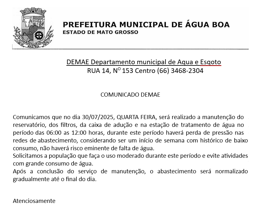 ÁGUA BOA – A Estação de Tratamento de Água do DEME passará por procedimento de limpeza. O serviço será nesta quarta-feira, das 6h às 12h.