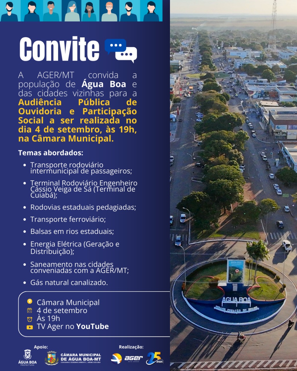 A AGER reforça que todos os moradores de Água Boa e região estão convidados a participar da audiência pública. Quem se sentir lesado pela qualidade dos serviços prestados ou desejar contribuir com propostas de melhorias terá a chance de se manifestar.