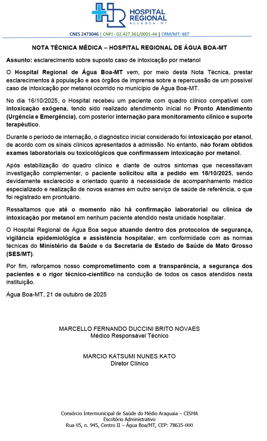 O Hospital Regional de Água Boa-MT vem, por meio desta Nota Técnica, prestar esclarecimentos à população e aos órgãos de imprensa sobre a repercussão de um possível caso de intoxicação por metanol ocorrido no município de Água Boa-MT.