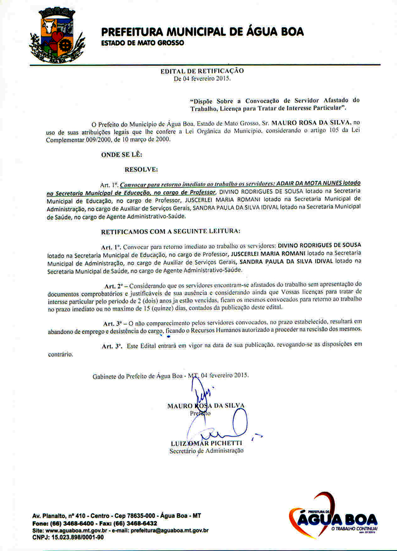 ÁGUA BOA - A Prefeitura Municipal de Água Boa divulgou Edital de Convocação de servidores que estão em gozo de licença não remunerada para tratar de interesse particular retificado. Confira:
