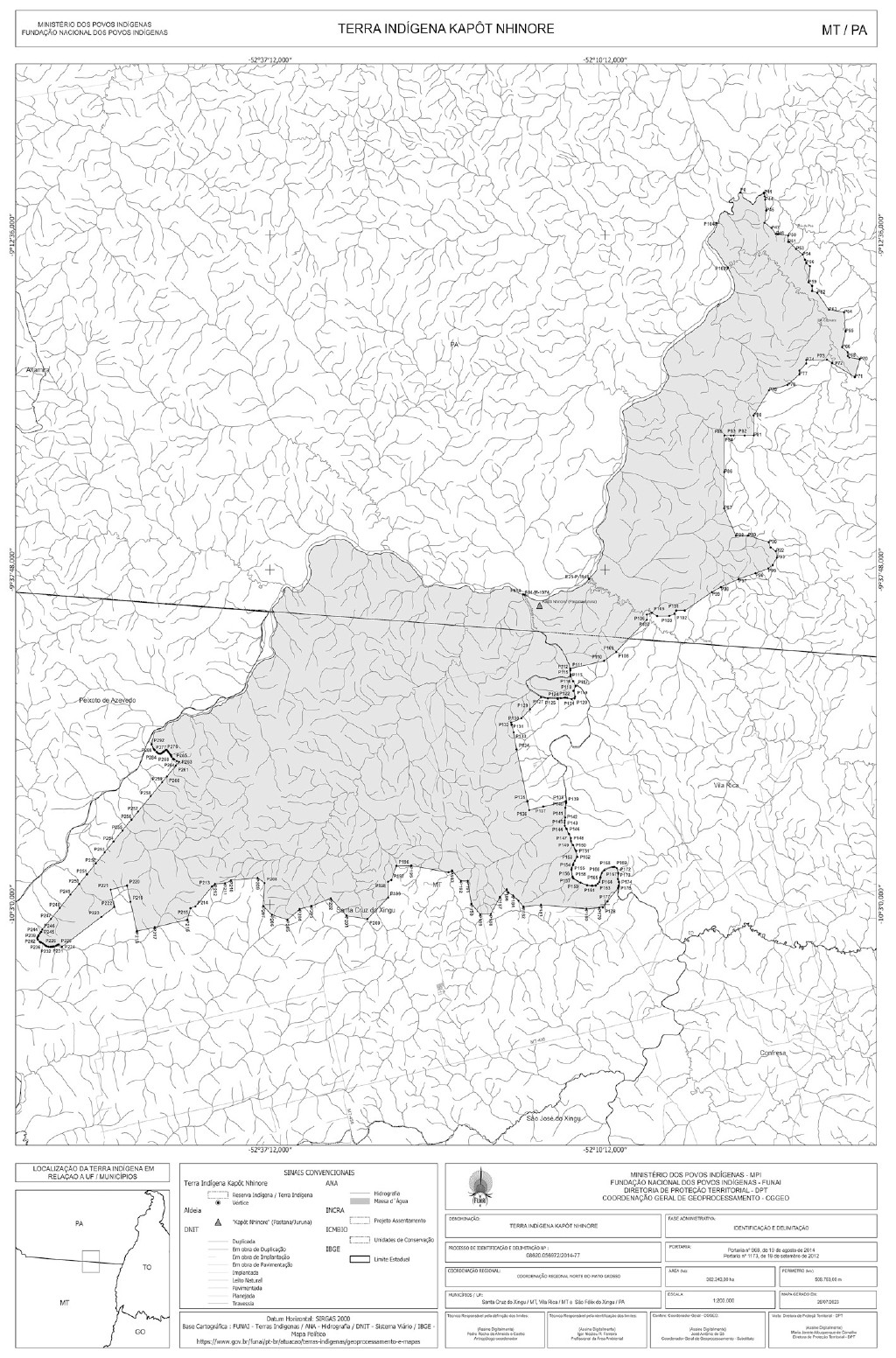 BRASÍLIA - A Fundação Nacional dos Povos Indígenas (Funai) aprovou os estudos de Identificação e Delimitação da Terra Indígena (TI) Kapôt Nhĩnore, localizada nos estados do Pará e Mato Grosso. O anúncio ocorreu nesta sexta-feira (28) durante um evento convocado pelo Cacique Raoni Metuktire na Aldeia Piaraçu (MT), com a presença de lideranças indígenas de todo o país e autoridades. Participaram a ministra dos Povos Indígenas, Sonia Guajajara, a presidenta da Funai, Joenia Wapichana, e o secretário Especial de Saúde Indígena, Weibe Tapeba, entre outros convidados.