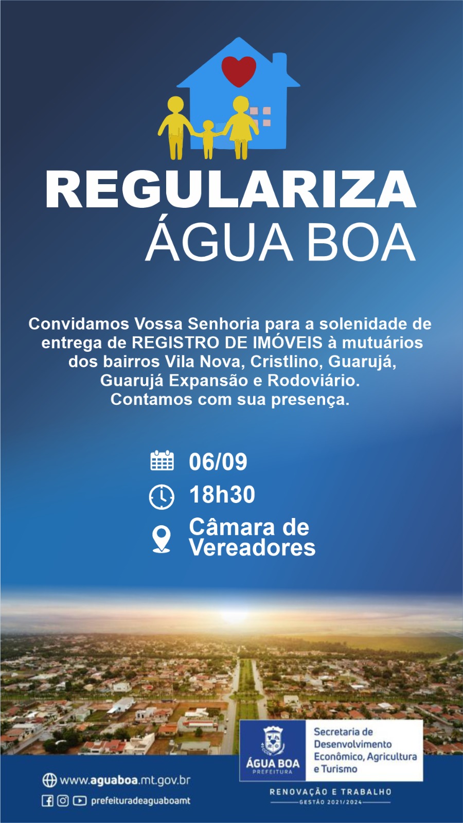 No dia 6 de setembro, mutuários dos bairros Vila Nova, Cristalino, Guarujá, Guarujá Expansão e Rodoviário receberão documentos oficiais.