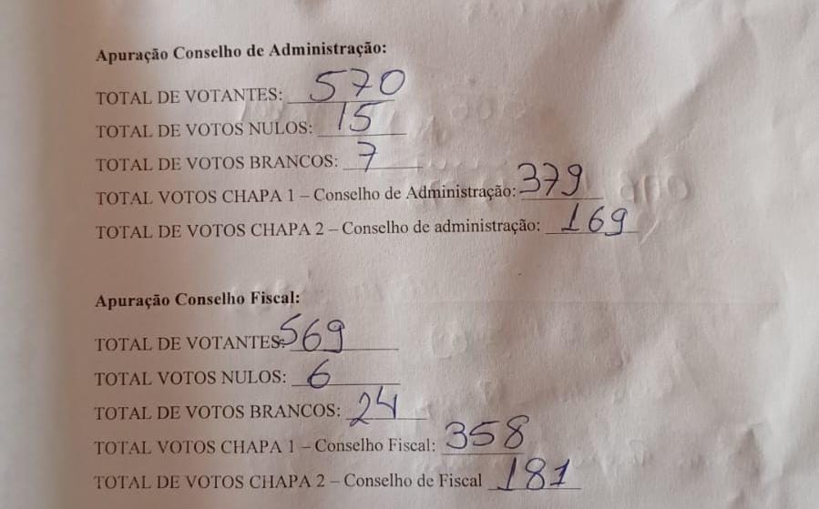O Conselho Fiscal da Chapa 01 recebeu 358 votos contra 181 da Chapa 02.