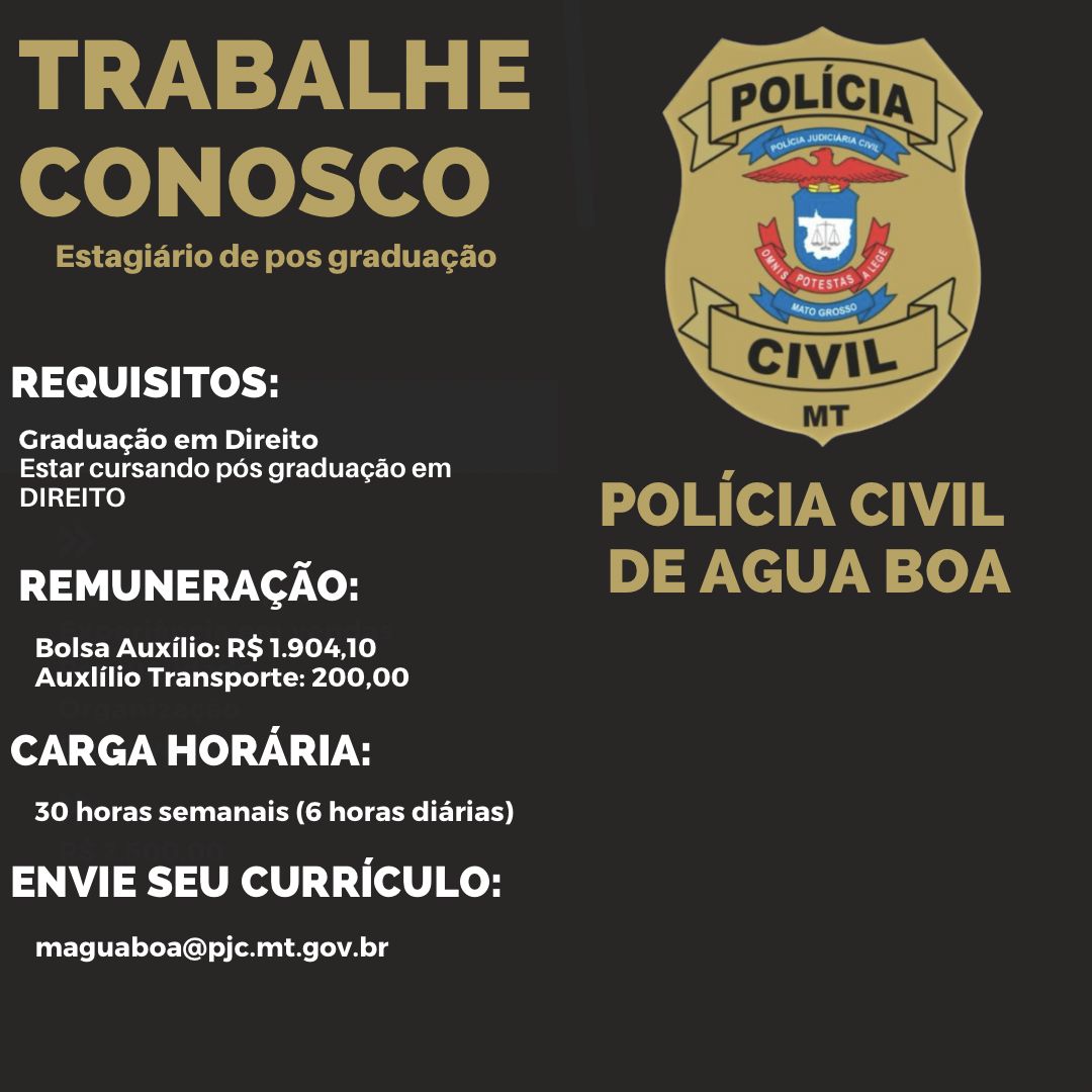 ÁGUA BOA - A Polícia Civil oferece vaga de estágio de pós-gradução.