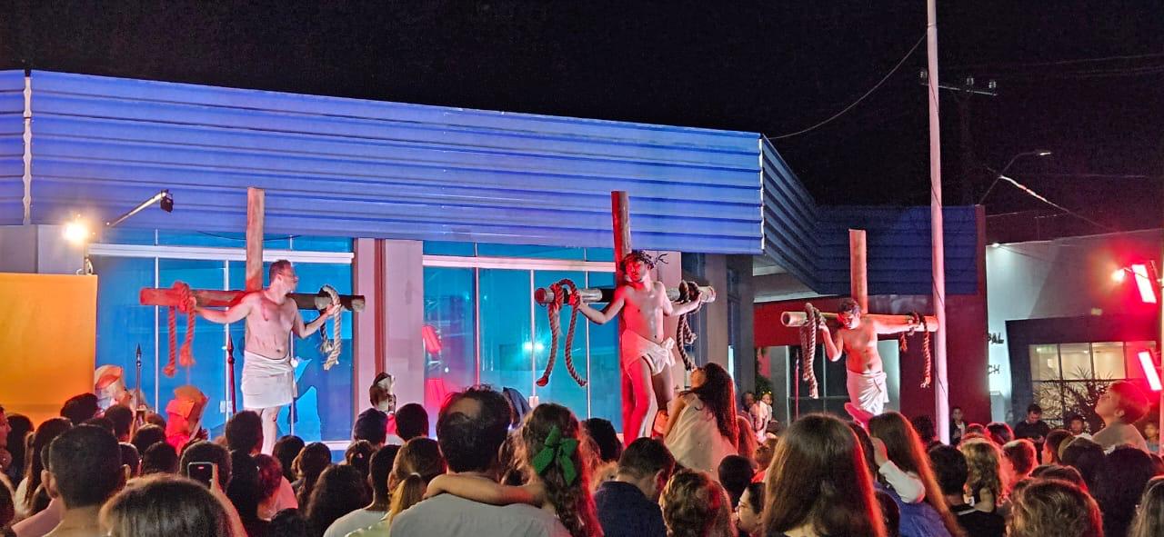 A encenação na Praça da Cultura foi enriquecida pela participação do Coral Municipal, que proporcionou uma trilha sonora emocionante, intensificando a atmosfera de reverência e devoção. Os espectadores puderam acompanhar cada estação da Via Sacra de forma imersiva, sendo convidados a refletir sobre o significado mais profundo da mensagem de amor e redenção que permeia essa narrativa milenar. (Ascom paróquia N.S.Aparecida)