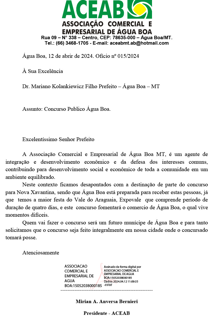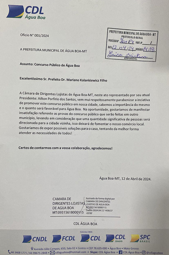 ÁGUA BOA – A ACEAB e a CDL enviaram ofício às autoridades reivindicando que o Concurso Público tenha alguns pontos de hospedagem revistos. As entidades de classe que representam as empresas associadas lutam para contribuir com o desenvolvimento social e econômico do município.