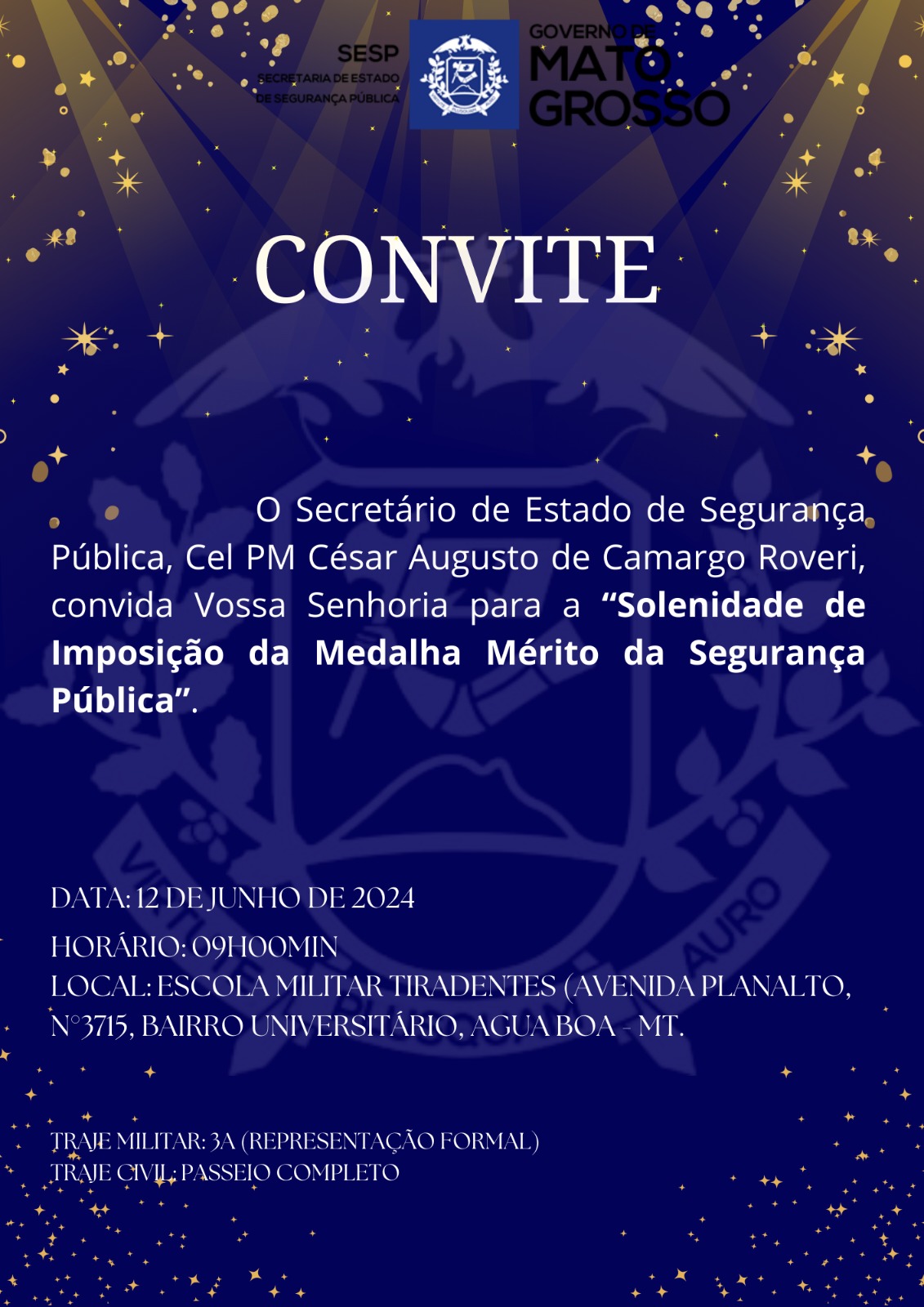 Secretaria da Segurança Pública entregará medalhas a policiais civis e militaresÁGUA BOA - A Secretaria Estadual de Segurança Pública promoverá entrega de medalhas aos policiais militares e policiais civis que se destacaram de forma exemplar em 2023 no Médio Araguaia.