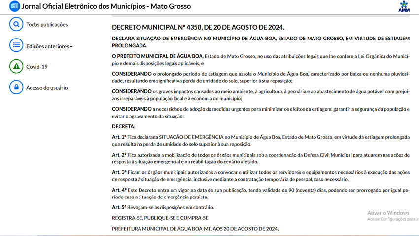 O decreto foi publicado no Site da Associação dos Municípios de Mato Grosso, com data de 20 de agosto.