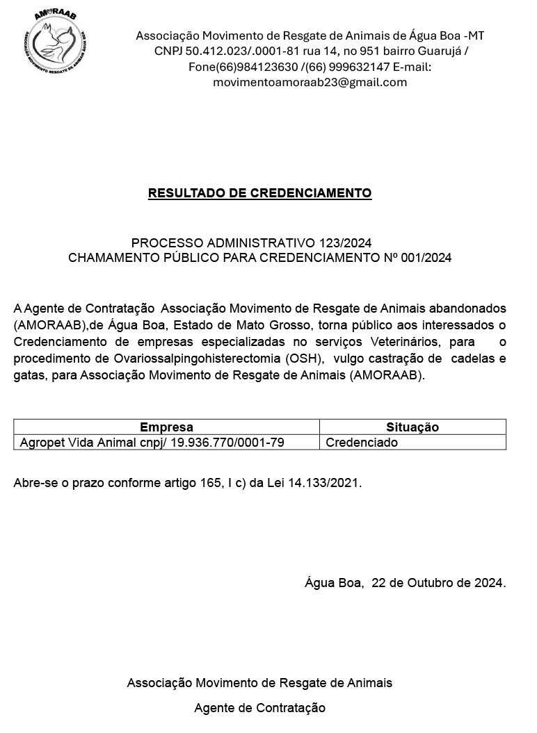 ÁGUA BOA – A Associação Movimento de Resgate de Animais Abandonados tornou público o credenciamento da empresa de serviços veterinários para o procedimento de castração de animais resgatados.