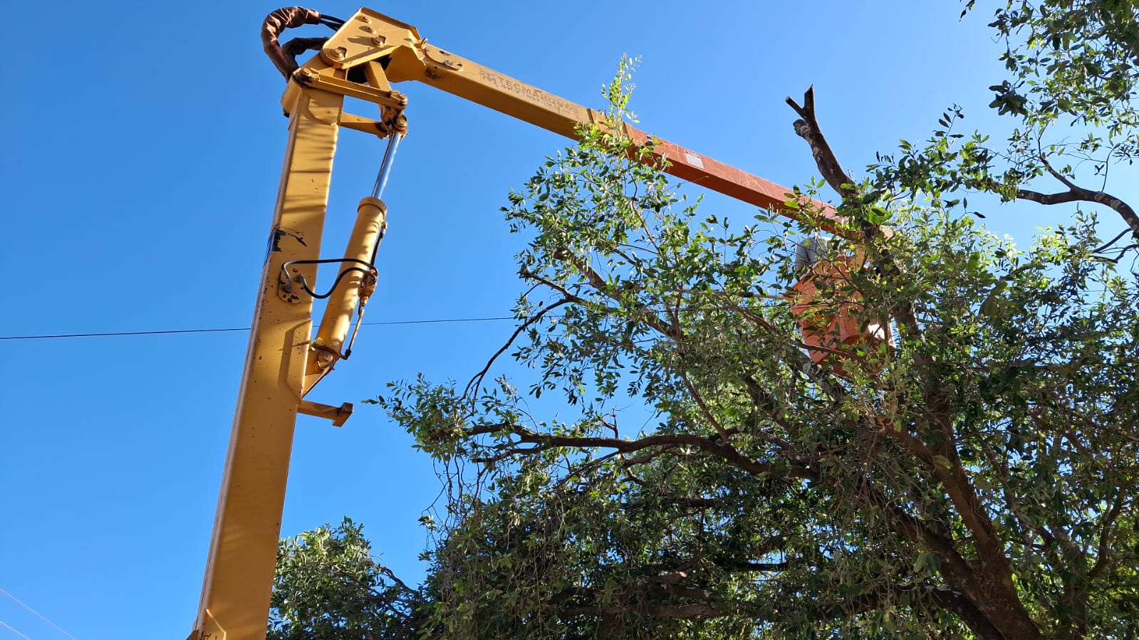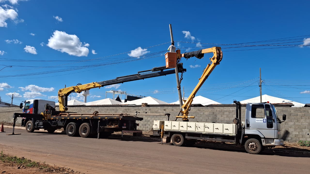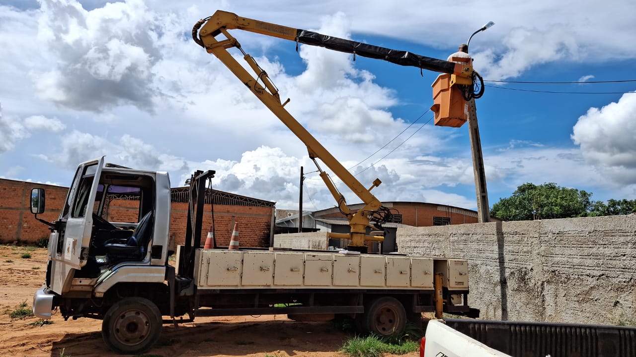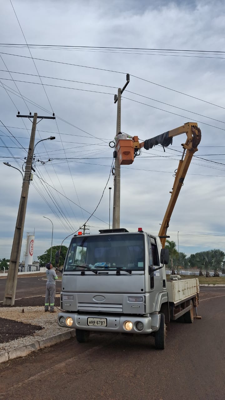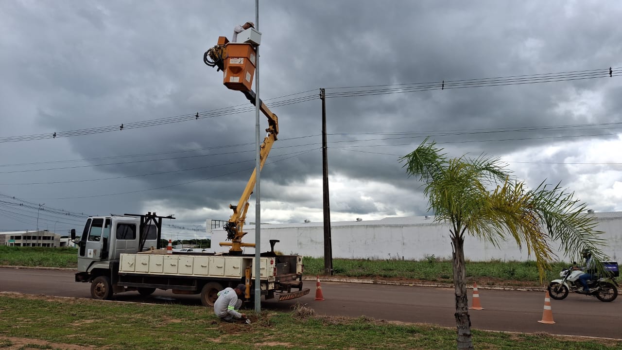 Hoje, um dos serviços é a manutenção na fiação elétrica da iluminação pública na Praça dos Arcos no setor Cristalino.