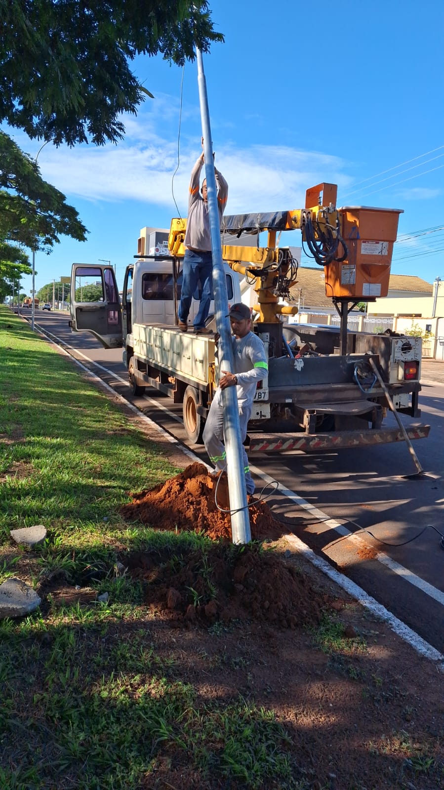 Hoje, foi reposto um poste que sustenta a iluminação pública, danificado em acidente de trânsito, na Av. Araguaia.