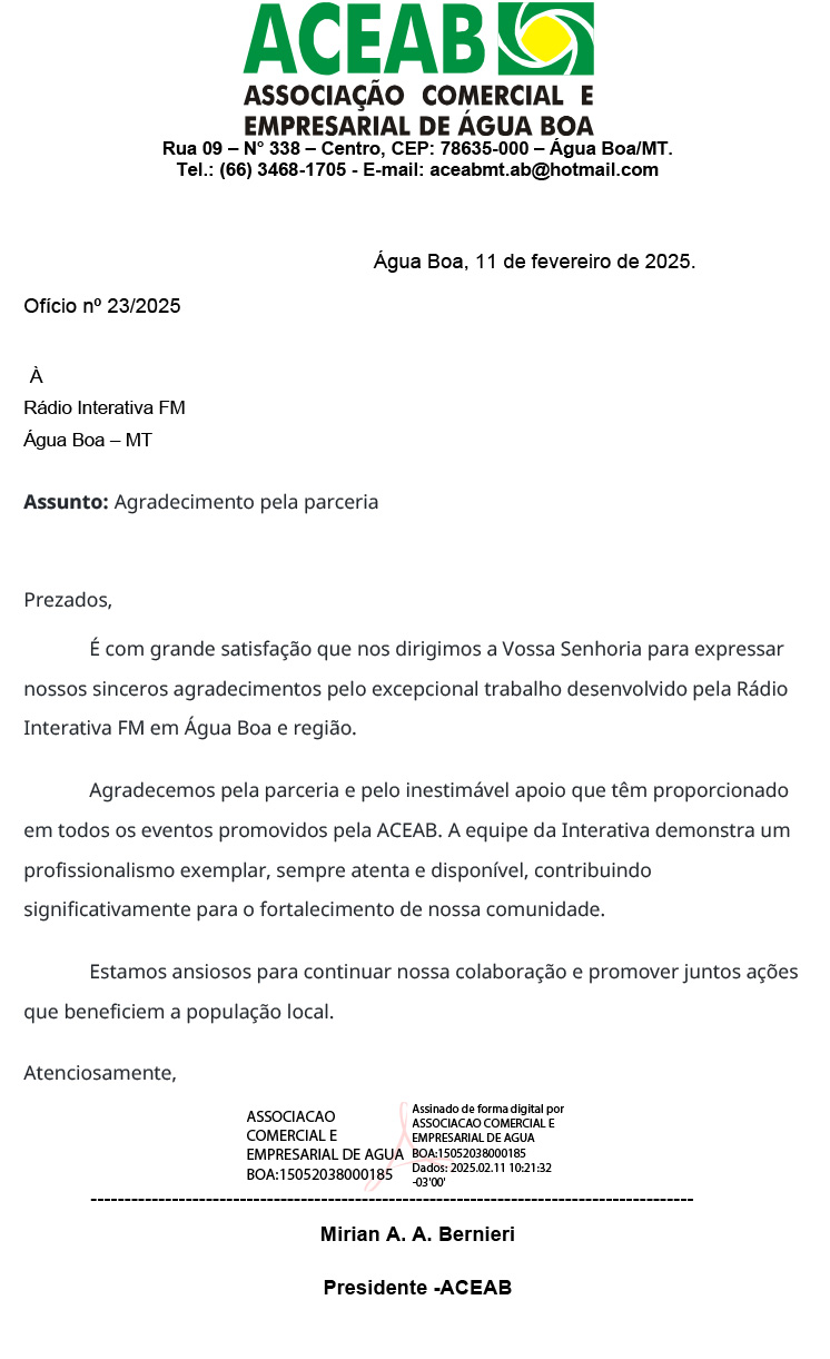 ÁGUA BOA - A Associação Comercial e Empresarial enviou ofício à Rádio Interativa.