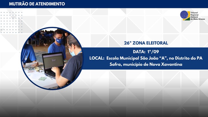 NOVA XAVANTINA - A Justiça Eleitoral fará um mutirão de atendimento no Distrito do PA Safra, município de Nova Xavantina, nesta sexta-feira, dia 1º de setembro, das 8h às 17h. Os serviços serão disponibilizados na Escola Municipal São João “A”, por iniciativa da 26ª Zona Eleitoral, em parceria com a Prefeitura de Nova Xavantina.