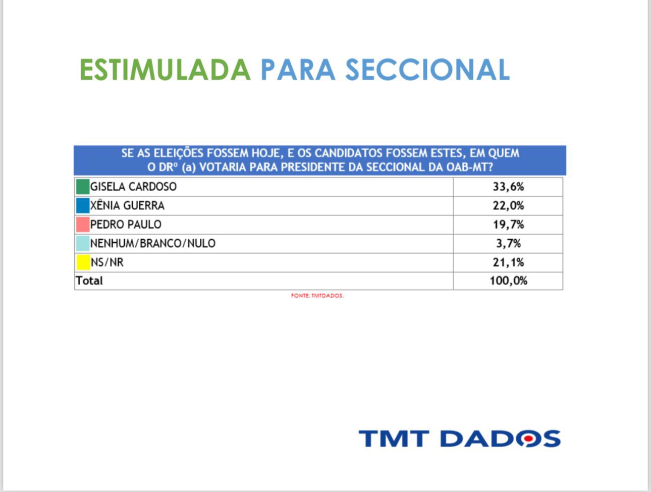 Os votos branco e nulo somam 3,7%. Não sabem ou não responderam corresponde a 21,1% dos entrevistados. A pesquisa foi realizada entre os dias 18 e 21 de setembro com 760 advogados das 29 subseções. A margem de erro é de 3%.