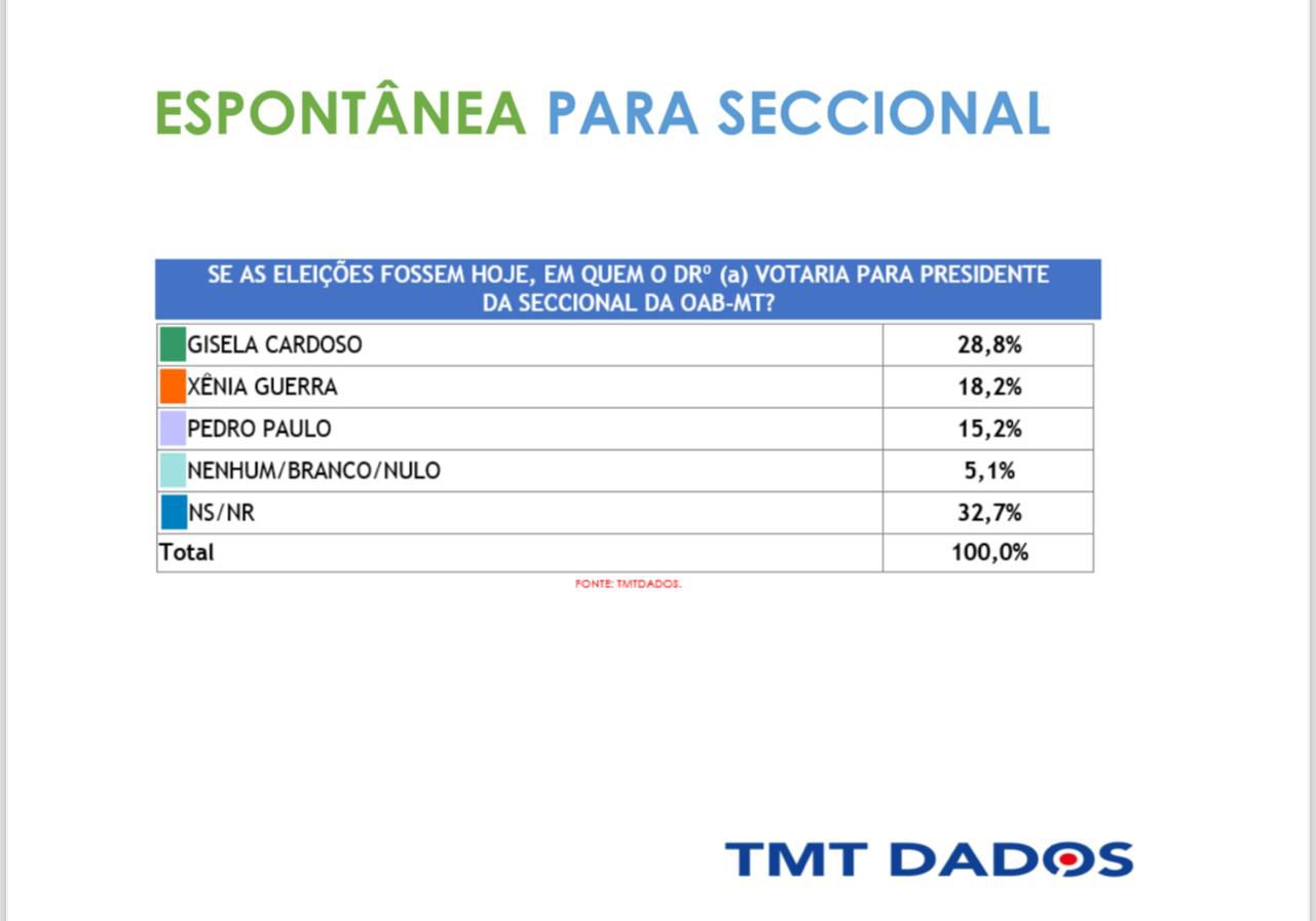 Na modalidade espontânea, aquela em que não cita os nomes dos candidatos. Xênia também já está em segundo lugar e é lembrada por 18,2% dos advogados entrevistados. Enquanto isso, a atual presidente caiu para 28,8% e o advogado tem 15,2% das intenções de votos. Brancos e nulos somam 5,1%, enquanto não sabem ou não responderam chegam a 32,7%.