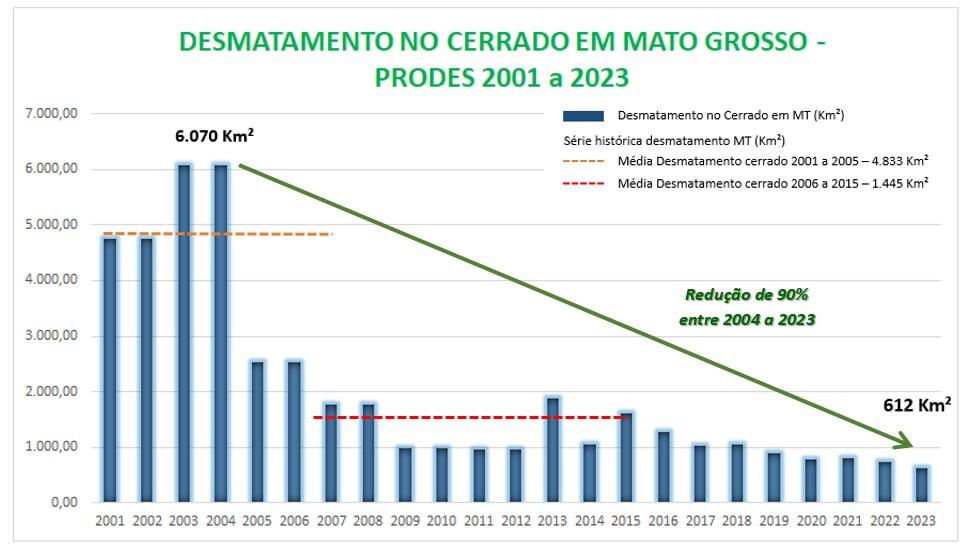 No acumulado de 2004 a 2023, Mato Grosso registrou diminuição de 90% na taxa de desmatamento no Cerrado. De acordo com Marega, o Estado é reconhecido pelo MapBiomas pela firme atuação no combate ao desmatamento.