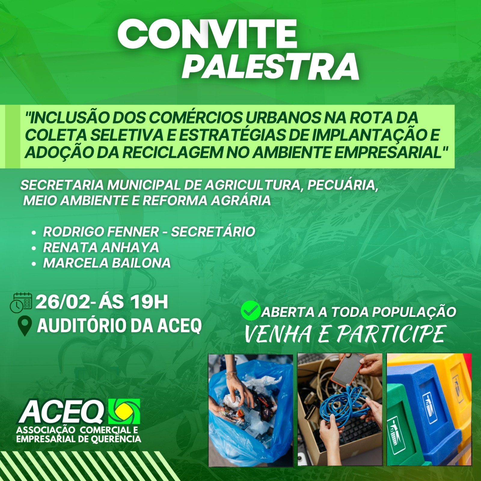 QUERÊNCIA – A ACEQ convida a todos para participarem de uma importante palestra com o tema "Inclusão dos comércios urbanos na rota da coleta seletiva e estratégias de implantação e adoção da reciclagem no ambiente empresarial". Dia 26/02, às 19 horas, no Auditório da ACEQ.