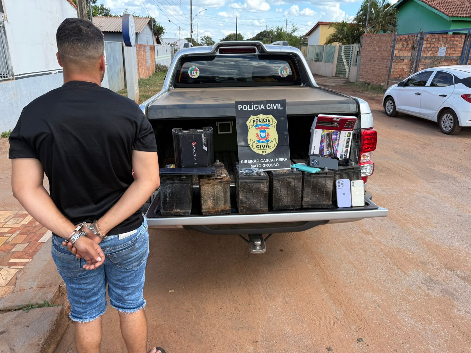 RIBEIRÃO CASCALHEIRA - Um homem foi preso neste domingo (25), por volta das 14h45, em Ribeirão Cascalheira, suspeito de receptação de baterias furtadas de uma fazenda localizada no município de Querência, na região de divisa com Cascalheira. A prisão foi efetuada pela Polícia Judiciária Civil, que já vinha investigando o caso desde o final de abril, quando o furto foi registrado.