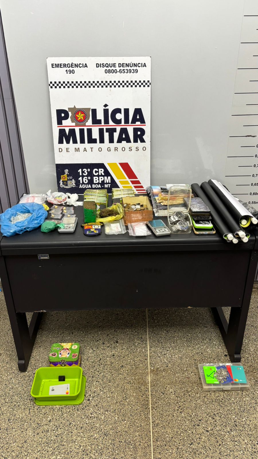 Na sequência, outros três envolvidos foram localizados em uma residência próxima à uma lanchonete, onde houve busca domiciliar. No local foram apreendidas drogas (pasta base e cannabis sativa), centenas de invólucros para tráfico, balança de precisão, dinheiro fracionado, raspadinhas e banners relacionados a jogos de azar fomentados pela organização criminosa. Em outro endereço, foram apreendidas porções de cannabis sativa, ecstasy, cocaína, mais invólucros e material típico do tráfico.