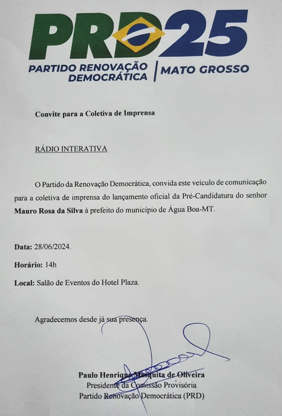 PRD lança pré-candidato a prefeitoÁGUA BOA – O partido da Renovação Democrática PRD fará lançamento oficial da pré-candidatura de Mauro Rosa da Silva a prefeito.