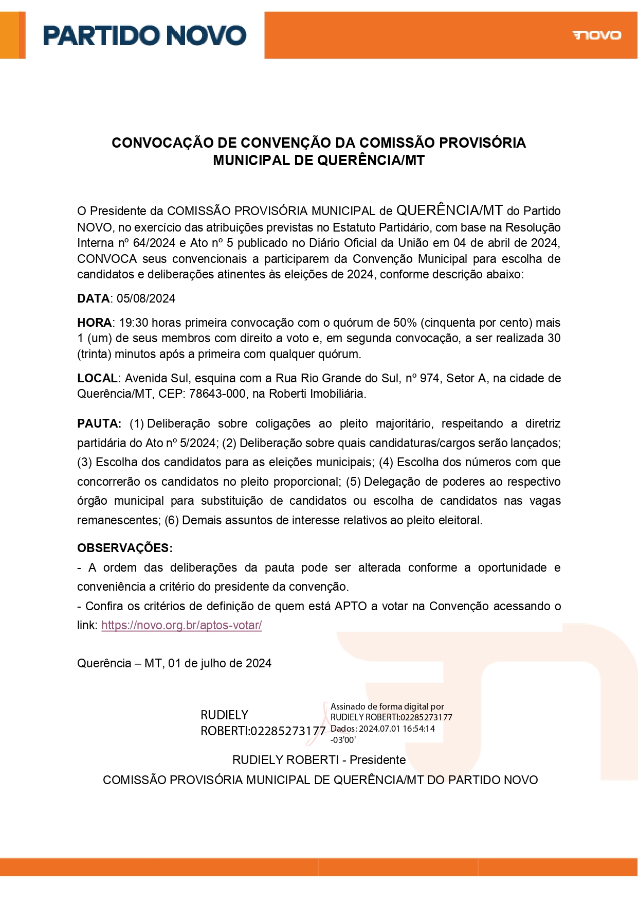 QUERÊNCIA - O Presidente da Comissão Provisória Municipal de Querência do Partido NOVO, Rudiely Roberti, convocou os membros para a Convenção Municipal, com o objetivo de escolher candidatos e discutir questões relacionadas às eleições de 2024. A convenção está marcada para o dia 5 de agosto de 2024, às 19h30, com uma segunda convocação às 20h00, se necessário, no endereço Avenida Sul, esquina com a Rua Rio Grande do Sul, nº 974, Setor A, na Roberti Imobiliária.