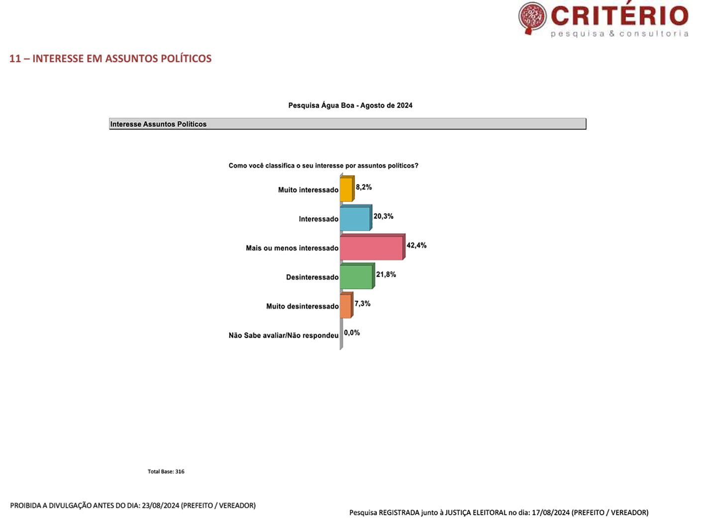 ÁGUA BOA – A Rádio Interativa encomendou pesquisa de opinião efetuada dias 17 e 18 de agosto em diversos bairros da cidade. Dos 20.453 eleitores, foram entrevistados 316 eleitores, cerca de 1,55% do total inscrito.