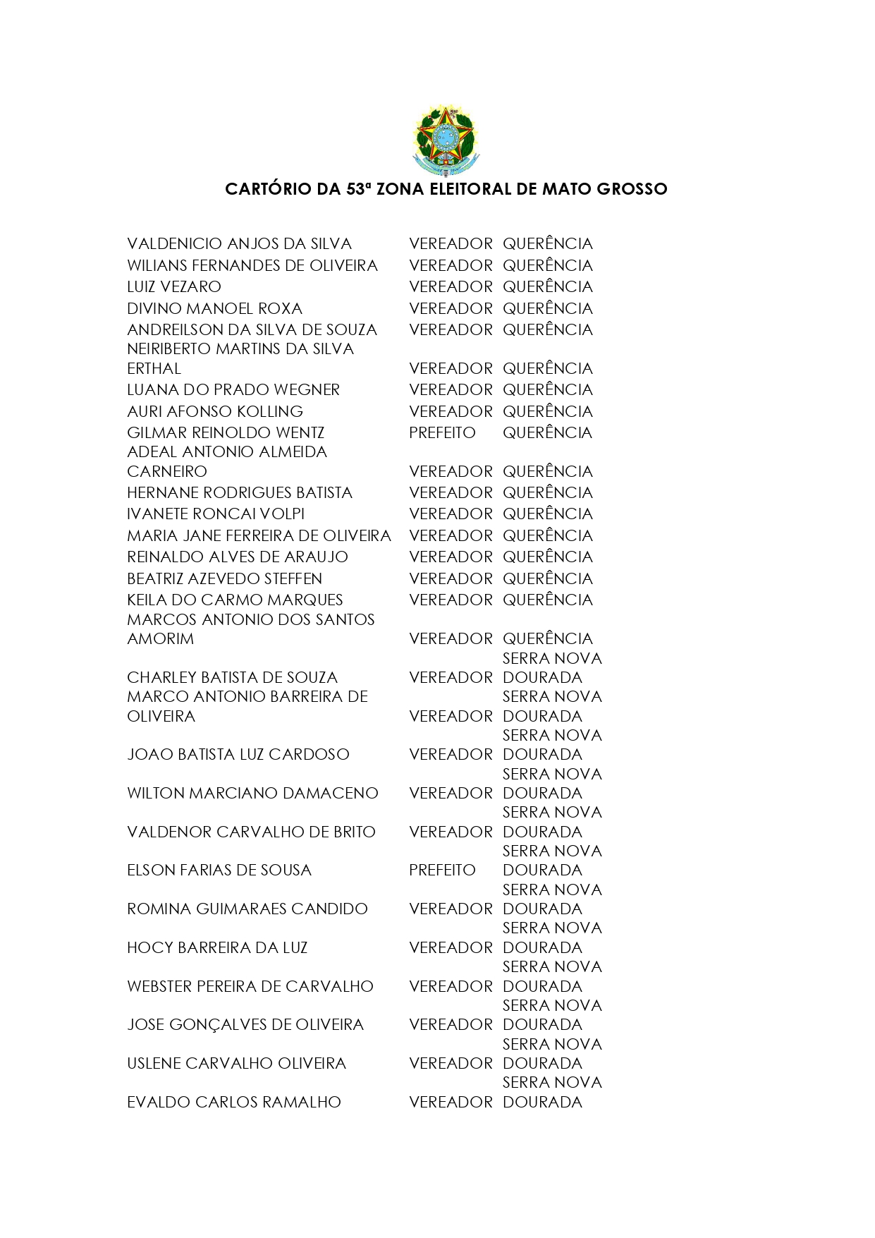 Em Serra Nova Dourada, o prefeito eleito é Elson Farias de Sousa e o vice João Pereira Luz acompanhado pelos vereadores e suplentes Charley Batista de Souza, Marco Antonio Barreira de Oliveira, João Batista Luz Cardoso, Wilton Marciano Damaceno, Valdenor Carvalho de Brito, Romina Guimarães Candido, Hocy Barreira da Luz, Webster Pereira de Carvalho, José Gonçalves de Oliveira, Uslene Carvalho Oliveira, Evaldo Carlos Ramalho, Edvan Magalhães Moreira, Elisangela da Silva Marinho e Mickeroni Pereira Luz